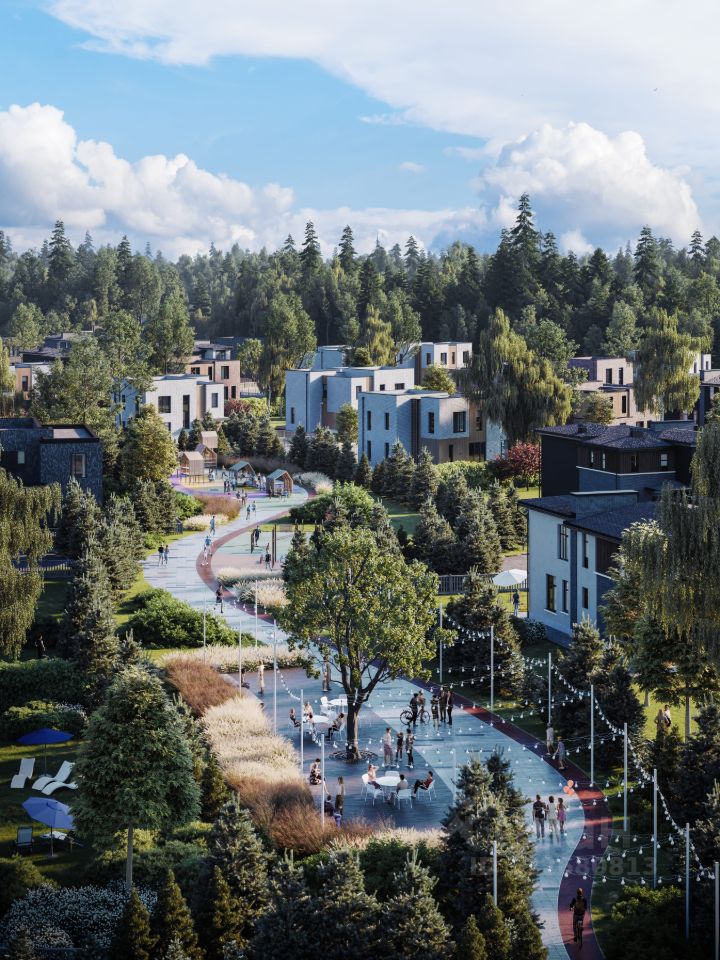 На площади 29 га запланирована зелёная пешеходная аллея с велодорожками и площадками для отдыха. У главного входа предусмотрено открытое пространство для собственных мероприятий жителей, рядом — игровые площадки и оборудованные зоны для воркаута. Все точки притяжения объединит центральная аллея протяжённостью 600 м.