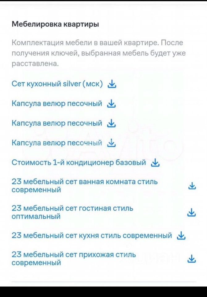 Кондиционер, Кухонный гарнитур с встроенной техникой (варочная панель, духовой шкаф, посудомоечная машина, вытяжка), отдельно стоящий холодильник, Мебель в прихожей, Мебель в ванной, Мебель в гостиной и спальне.