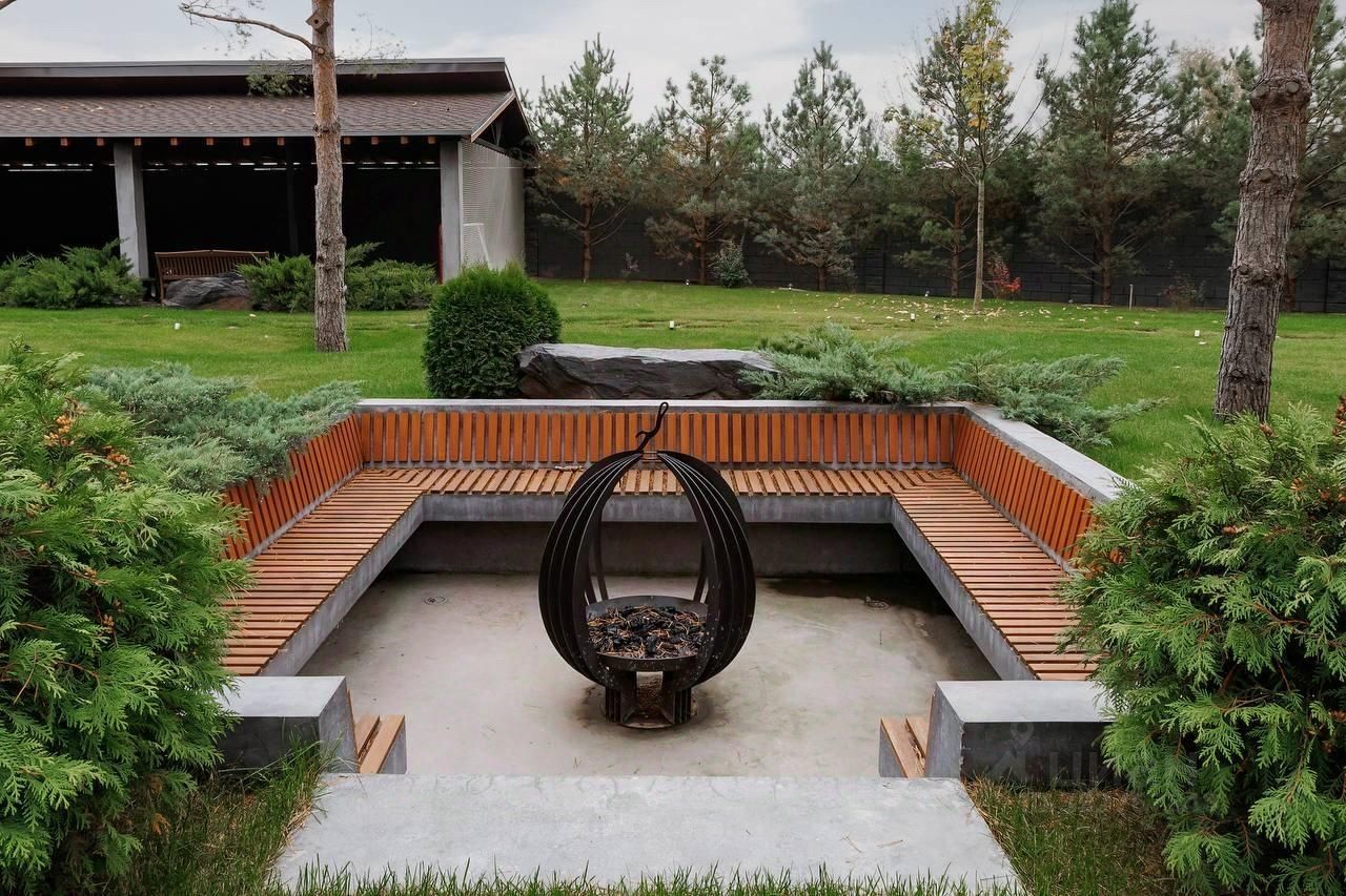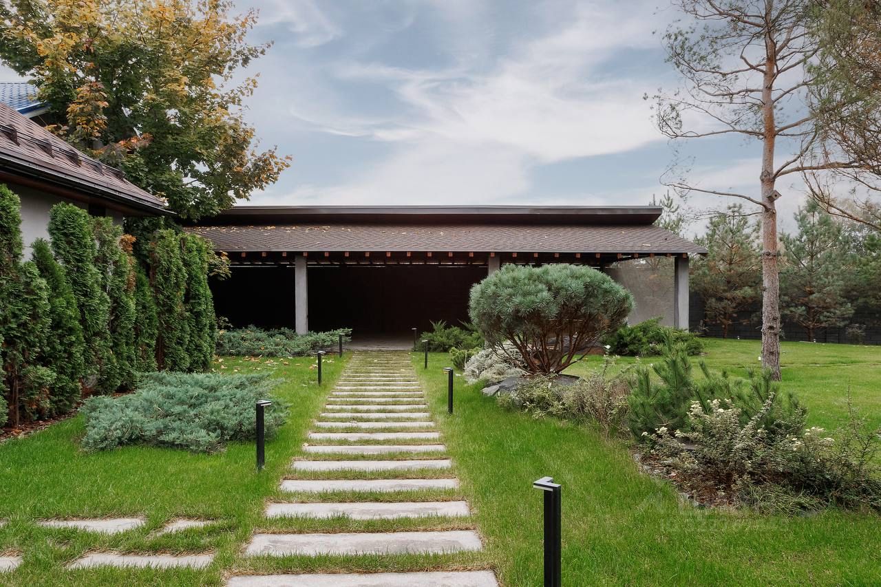 Участок оформлен в стиле ландшафтного парка с вечнозелёными растениями, что позволяет наслаждаться видами круглый год.