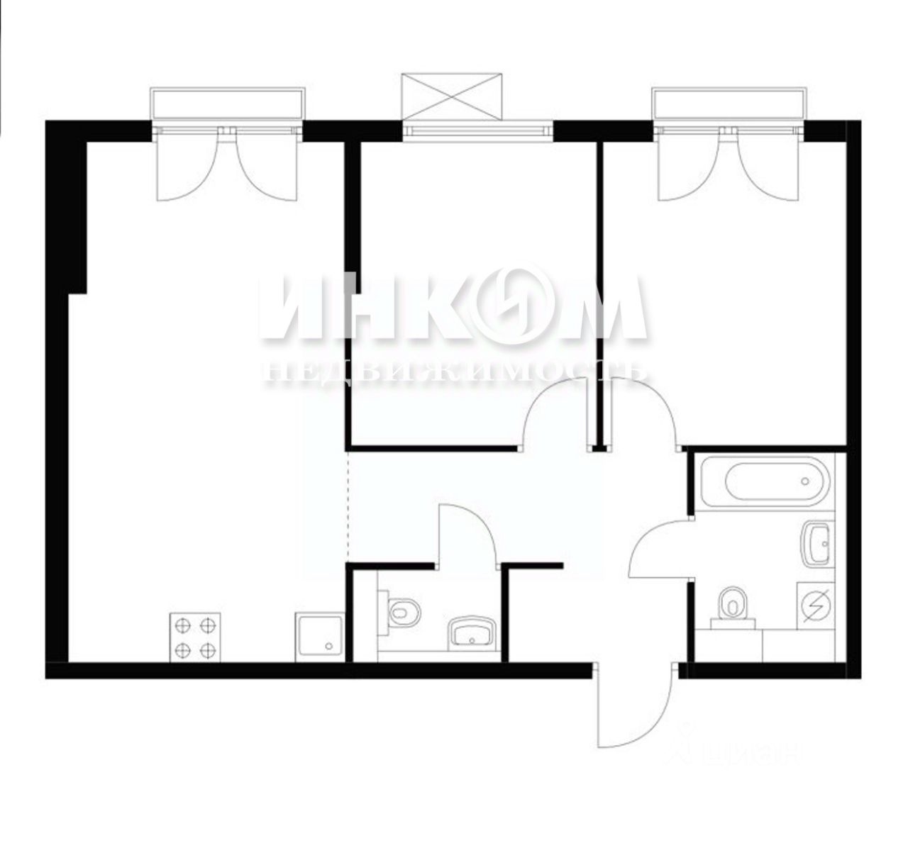 Просторная кухня-гостиная площадью 20,2 кв.м. и две изолированные комнаты. Два санузла. Два балкона. Окна выходят в тихий двор.
