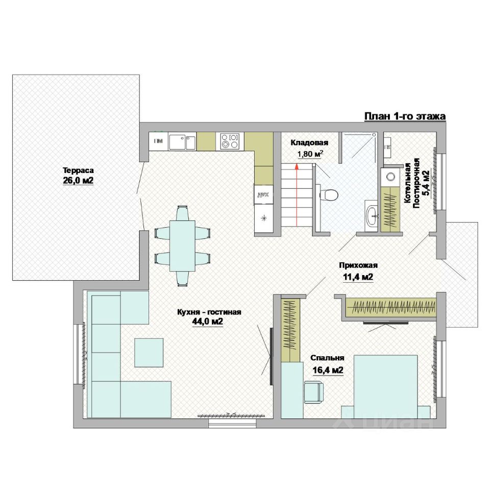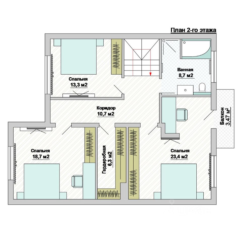 Состав помещений: 1 этаж: прихожая, жилая комната (спальня/кабинет), санузел с кладовой, кухня-столовая-гостиная с выходом на террасу, котельная-постирочная. 2 этаж: три спальни, одна из которых с выходом на балкон и зоной под кабинет, гардеробная и санузел. 3 этаж - мансардный свободной планировки.