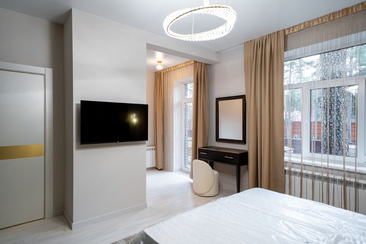 Внутренняя отделка класса премиум по дизайн-проекту. Немецкая и итальянская сантехника, крупноформатный керамогранит, паркетная доска, дизайнерские двери, итальянские дизайнерские обои и декоративная штукатурка, люстры и светильники. Дом с мебелью и техникой, полностью готов к проживанию.