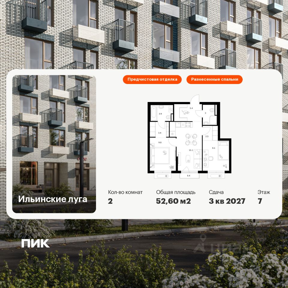 Продаётся 2-комн. квартира площадью 52,6 кв.м на 7 этаже 9 этажного дома (Корпус 4.3, Секция 5) проекта ПИК Ильинские луга. Светлый просторный подъезд на уровне земли, функциональная планировка, большие окна, предчистовая отделка.
