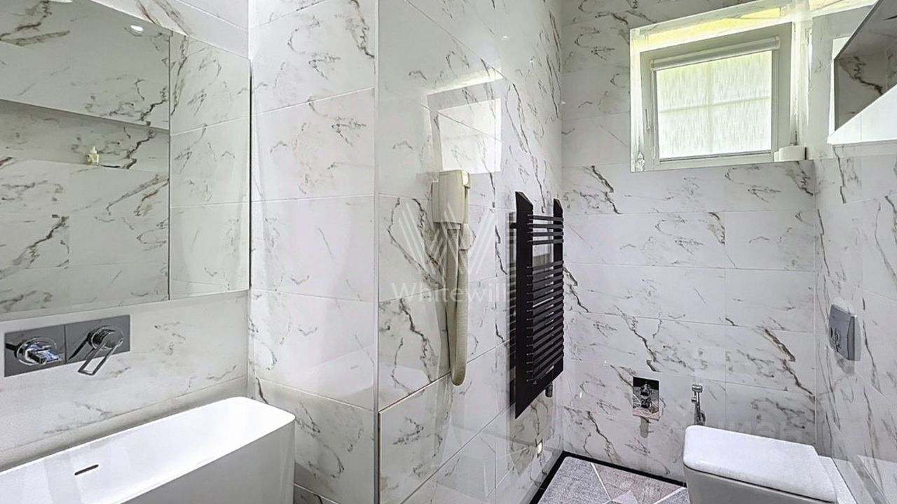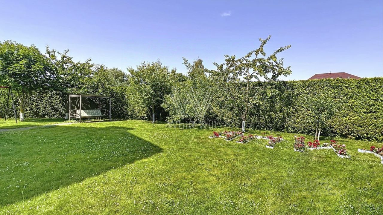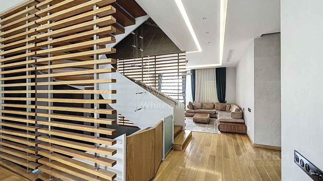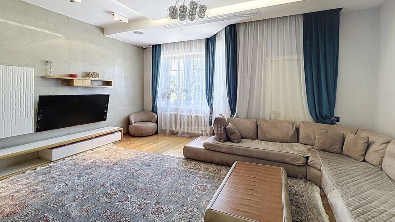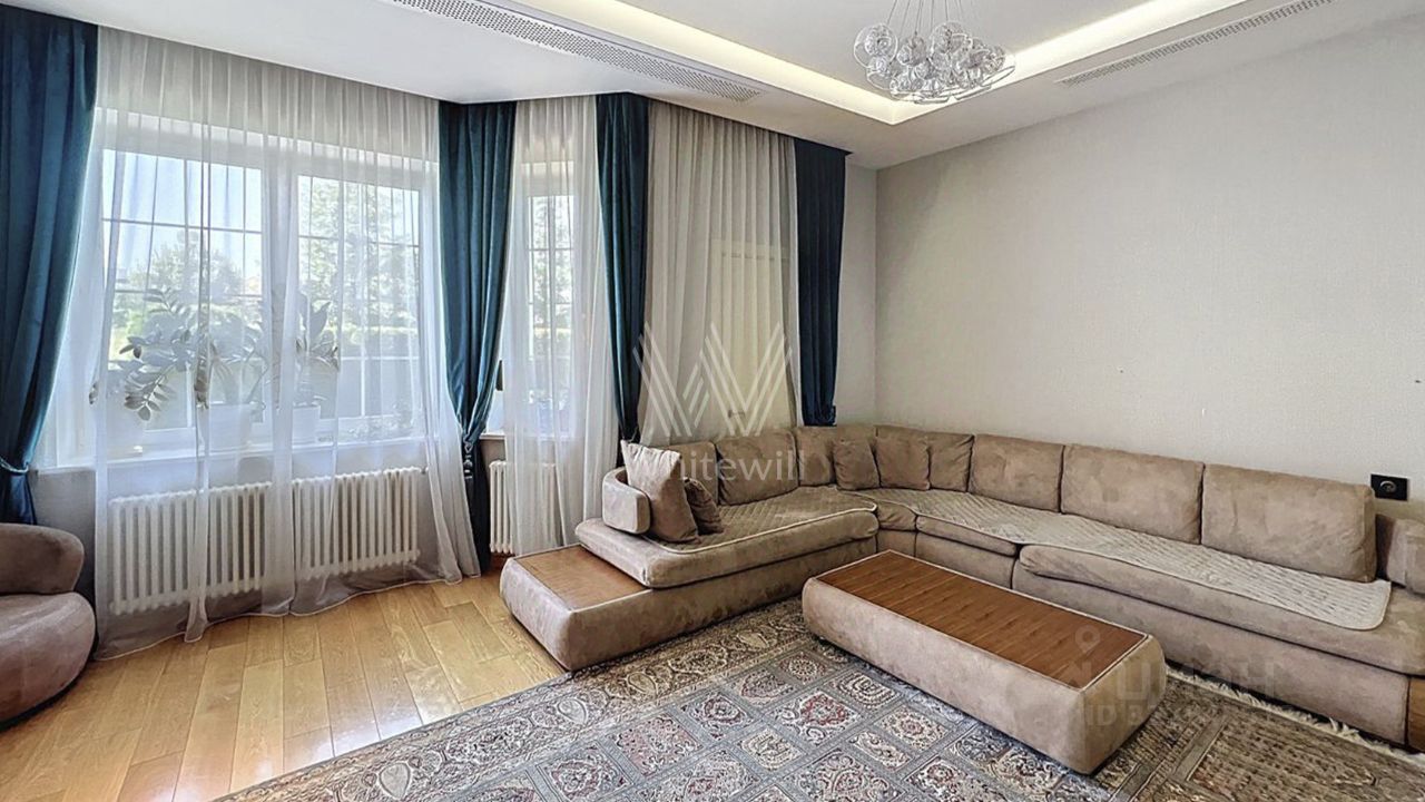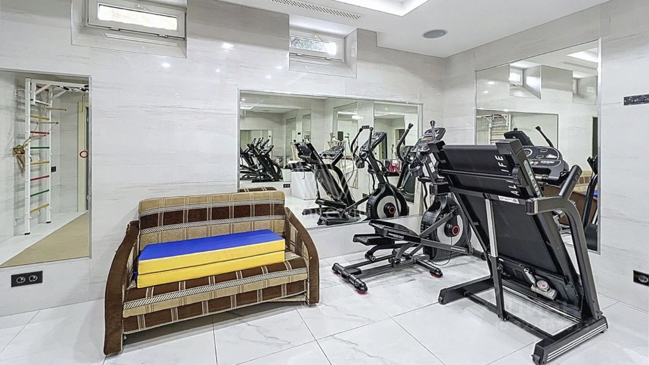 Планировка включает просторную гостиную, кухню с обеденной зоной, столовую, 5 спален и вместительные гардеробные. На цокольном уровне разместили тренажерный зал, хаммам, комнату отдыха и помещение свободного назначения, где можно обустроить библиотеку или детскую игровую. 2 входа в дом обеспечивают дополнительный комфорт. Для машин предусмотрен отдельностоящий двухместный гараж. Участок благоустроен — здесь засеян аккуратный газон, растут деревья, высажены цветы, а стройные туи, высаженные по периметру, создают атмосферу уюта и приватности.