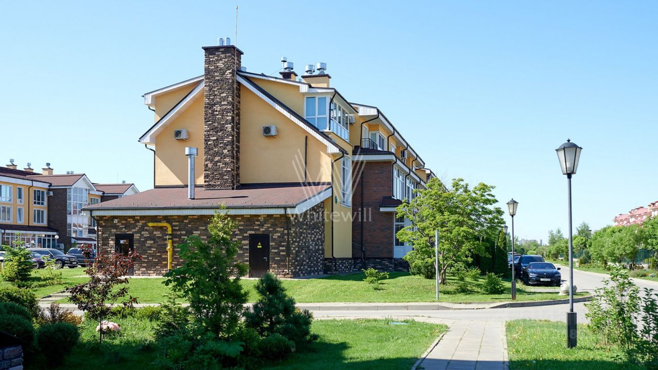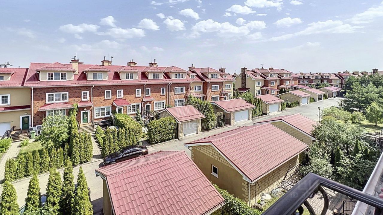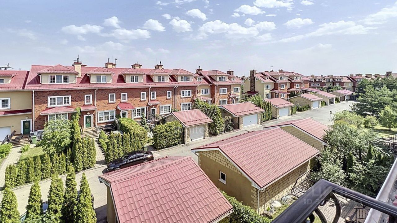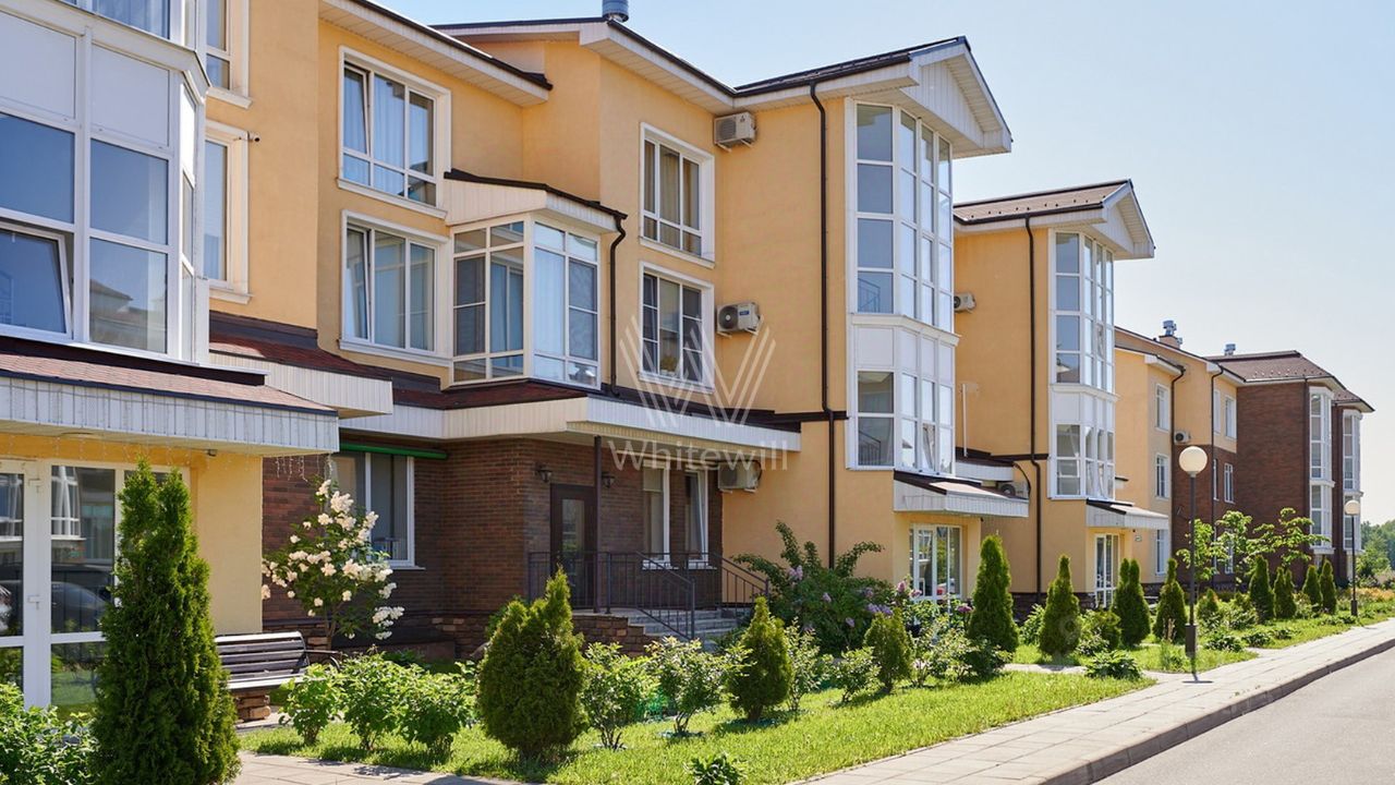 Ангелово-Резиденц. Загородный угловой таунхаус площадью 450 м² расположен на полевом участке 2 сотки. Фасад, выполненный в европейском стиле, облицован бежевой штукатуркой, благородным клинкерным кирпичом, а также украшен элегантными колоннами и белоснежными наличниками. Современные интерьеры выдержаны преимущественно в светлых тонах и укомплектованы комфортной мебелью, бытовой техникой и сантехникой от ведущих производителей.