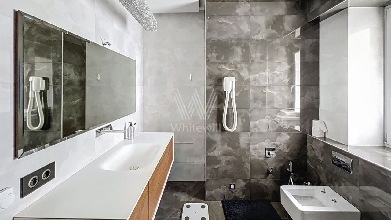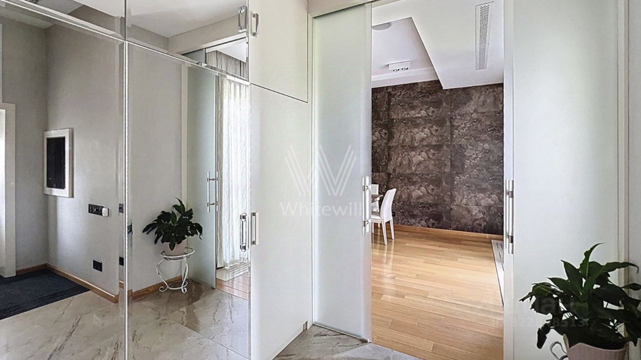 Планировка включает просторную гостиную, кухню с обеденной зоной, столовую, 5 спален и вместительные гардеробные. На цокольном уровне разместили тренажерный зал, хаммам, комнату отдыха и помещение свободного назначения, где можно обустроить библиотеку или детскую игровую. 2 входа в дом обеспечивают дополнительный комфорт.