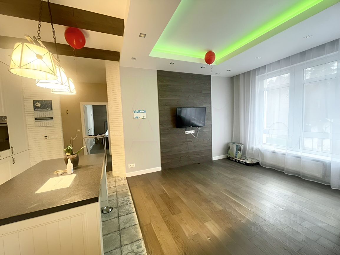 Пол-массив, Стена под ТВ отделана декоративными панелями под дерево, Многоуровневый потолок с Led подсветкой и точечными светильниками, Кондиционер Mdv остается.