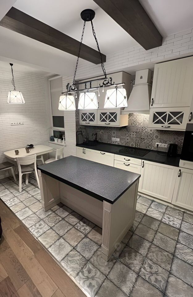 Столешница на острове — искусственный камень. Столешница в основной части с интегррованной раковиной — искусственный камень. Фартук — плитка. Зона гостинной: