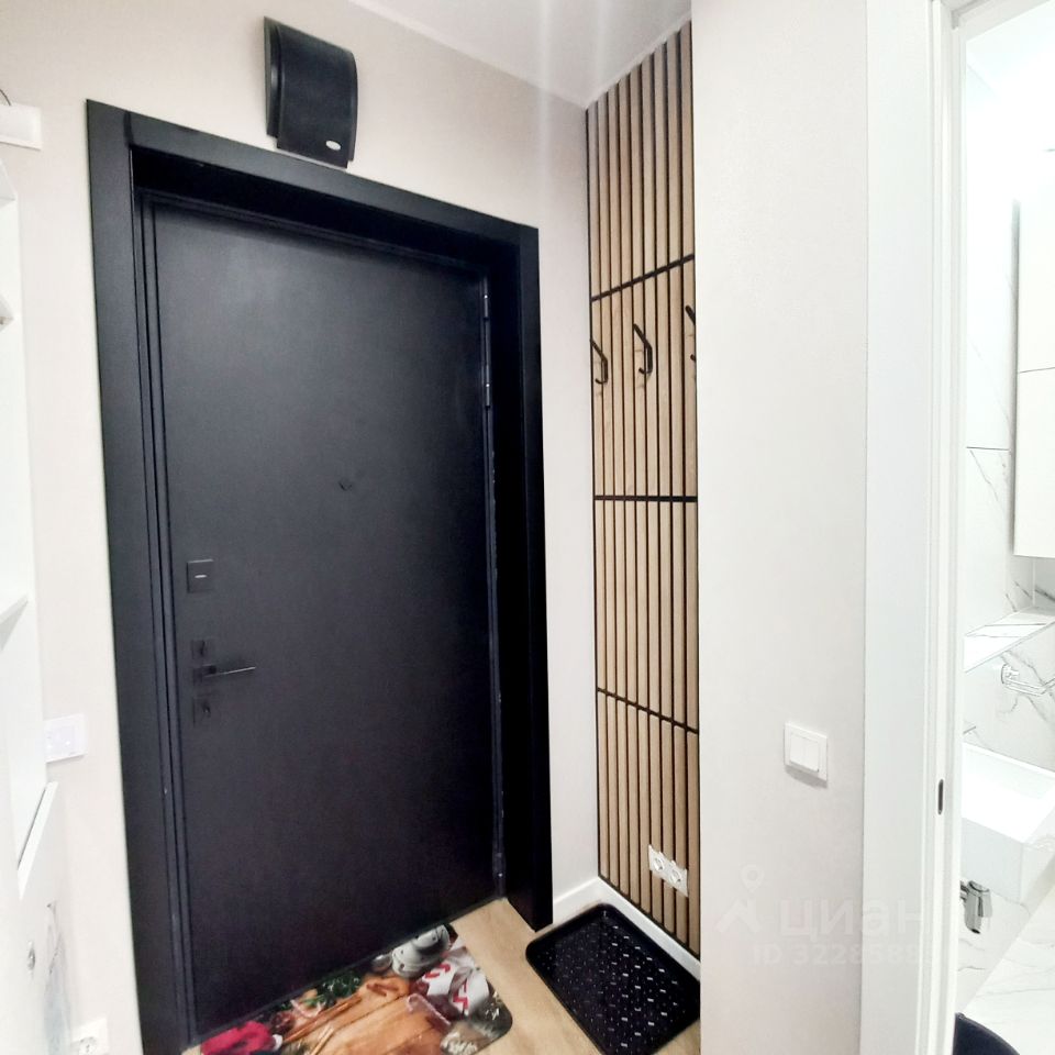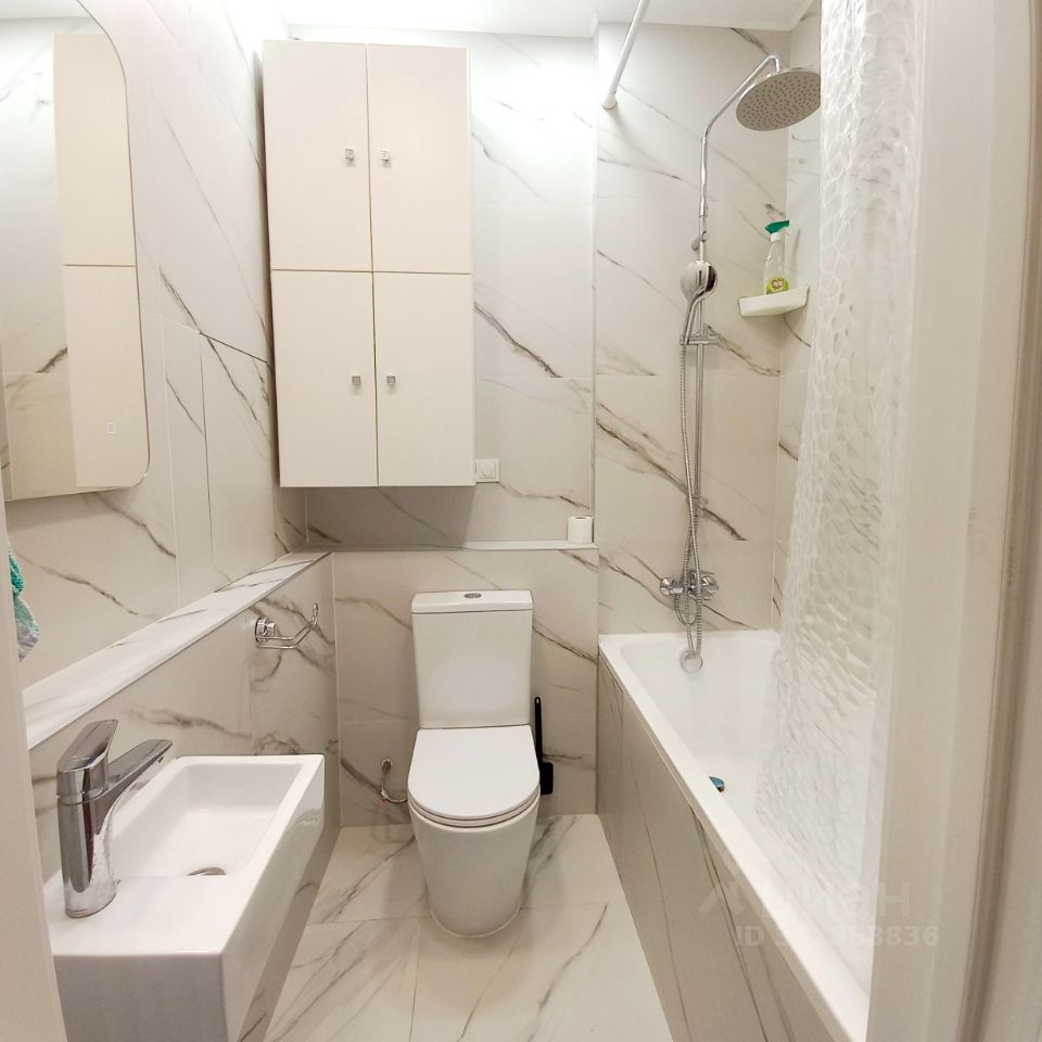 Полностью оборудованный санузел - ванна, унитаз, раковина, полотенцесушитель, зеркало с подсветкой, навесной шкаф. В прихожей - вешалка, шкаф с закрытыми и открытыми полками, пуф, обувница.