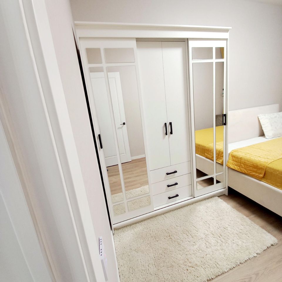 В СПАЛЬНЕ: - двуспальная кровать 160*200 Ancona Magica box, анатомический матрас Ascona Family mild (степень жесткости регулируется), под кроватью имеется место для хранения белья и др. вещей, - вместительный зеркальный шкаф для вещей и одежды.