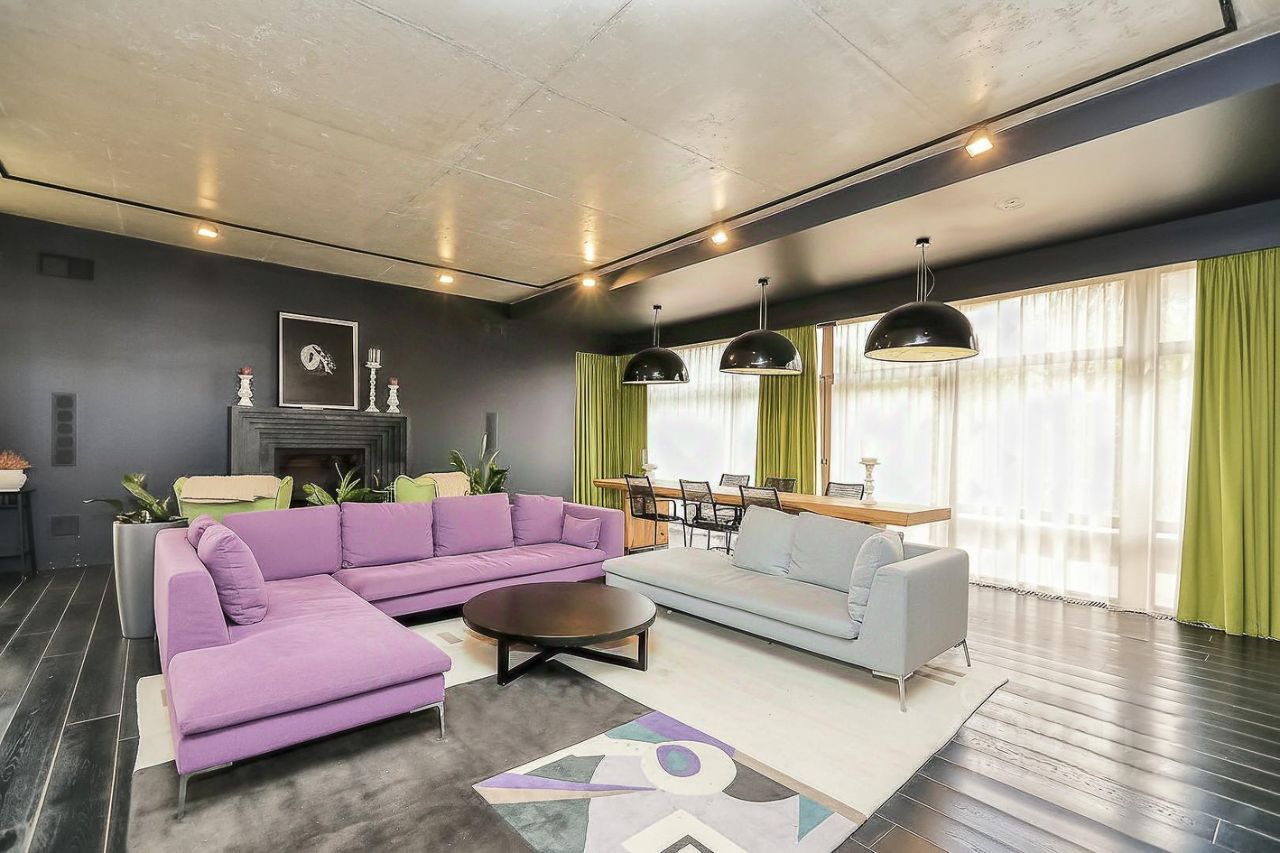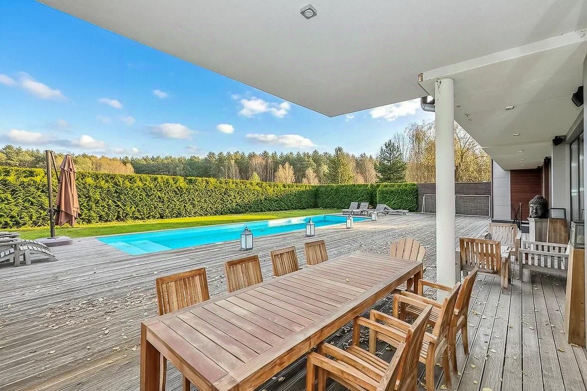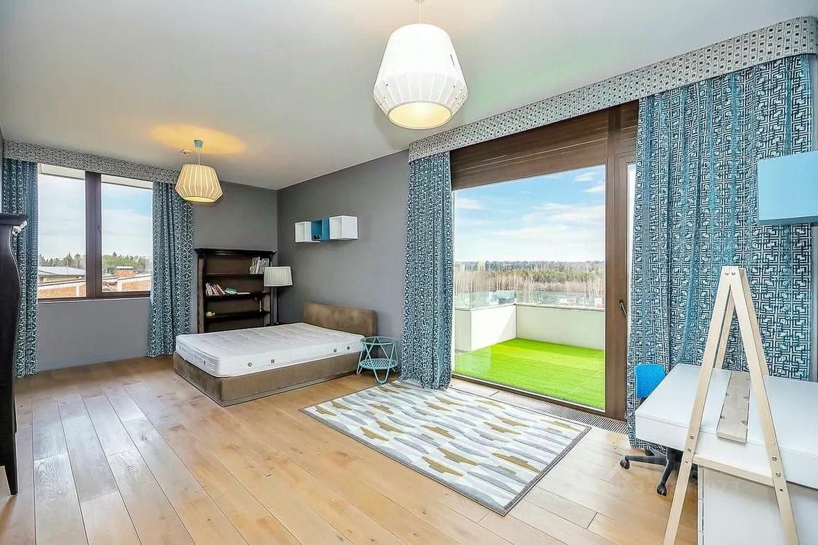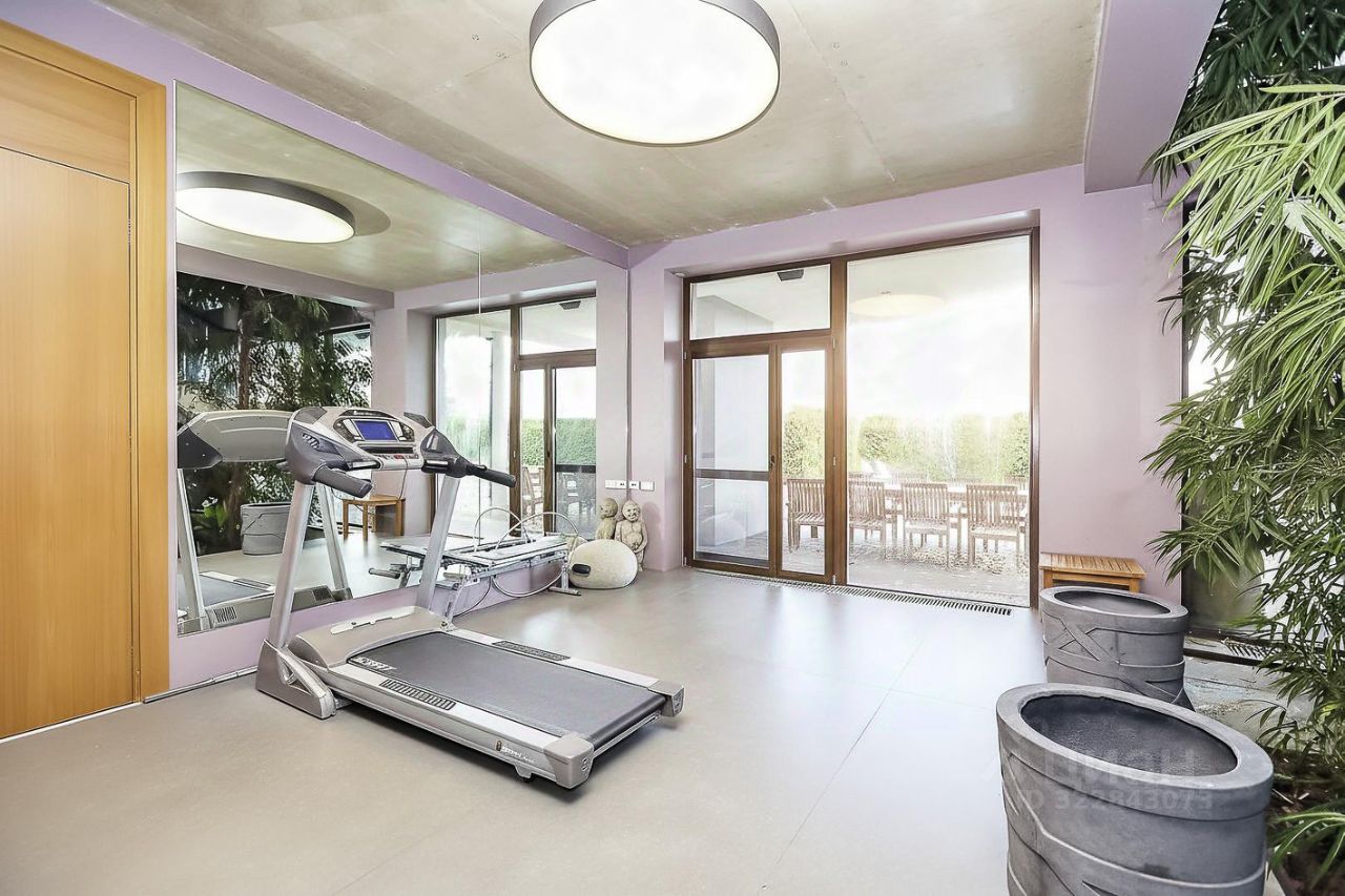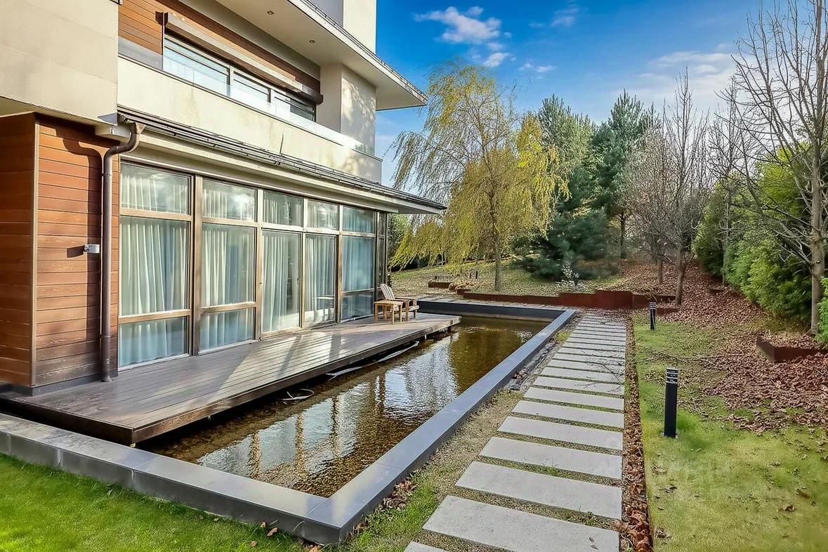 Есть открытый бассейн, площадка для детей, пруд для рыбок, грядки для души. Общая площадь дома 832 кв.м включает в себя цоколь со SPA-зоной, массажный кабинет, блок для персонала, спортзал.