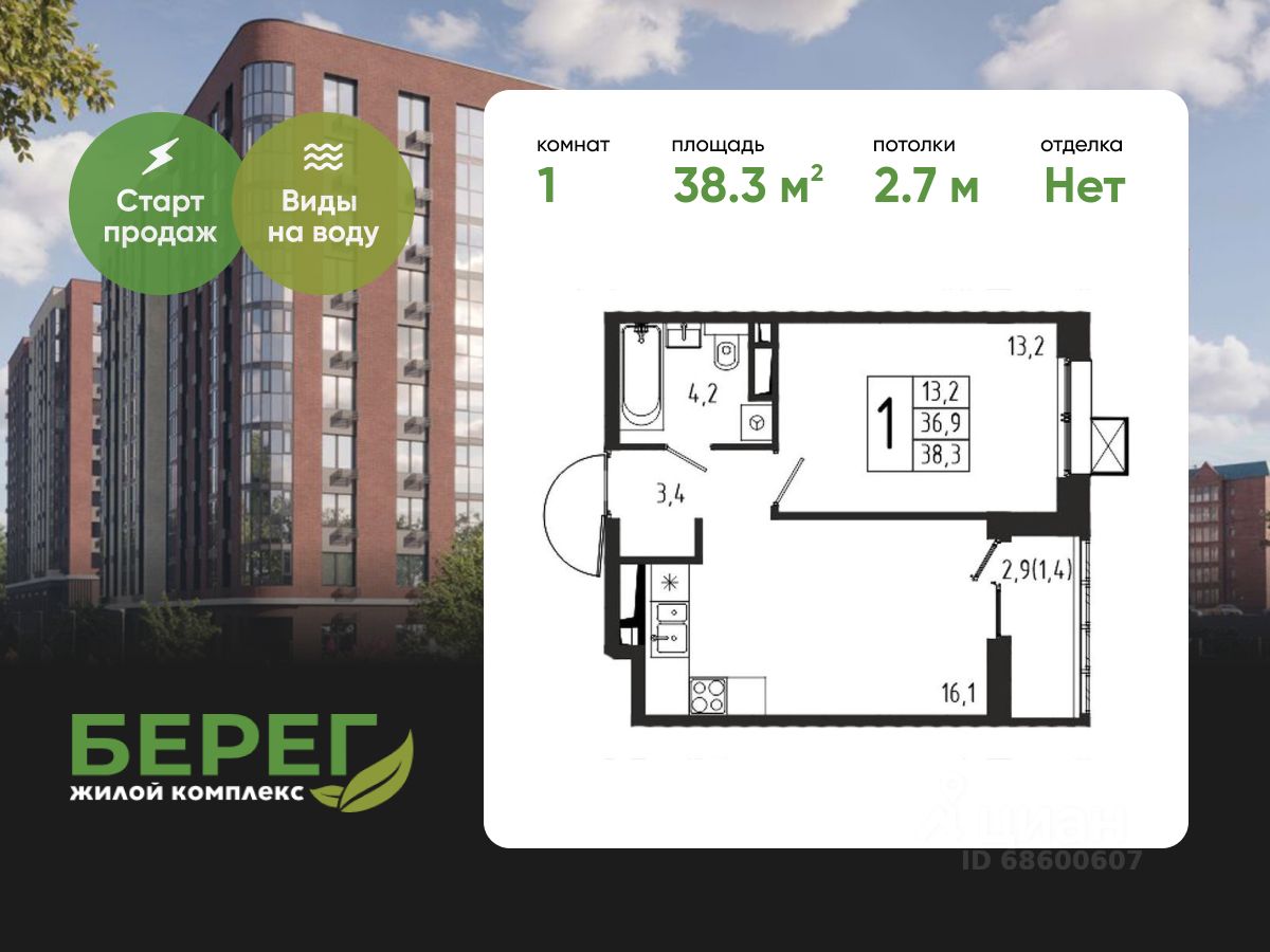 Продаётся 1-комнатная квартира в строящемся доме (Корпус 4 (2 очередь)), общей площадью 38.30 кв.м., на 2 этаже.