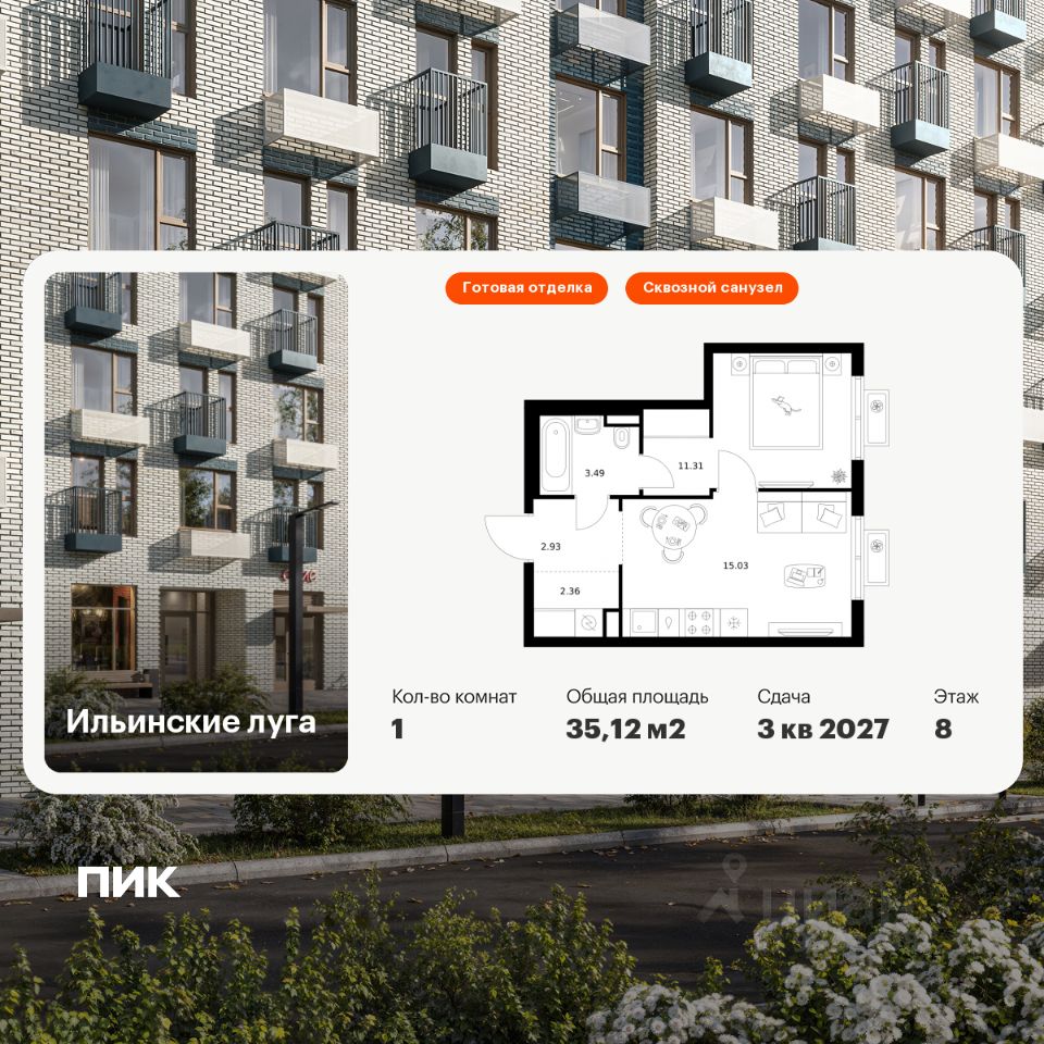 Продаётся 1-комн. квартира площадью 35,12 кв.м на 8 этаже 9 этажного дома (Корпус 4.1, Секция 2) проекта ПИК Ильинские луга. Светлый просторный подъезд на уровне земли, функциональная планировка, большие окна, c отделкой.