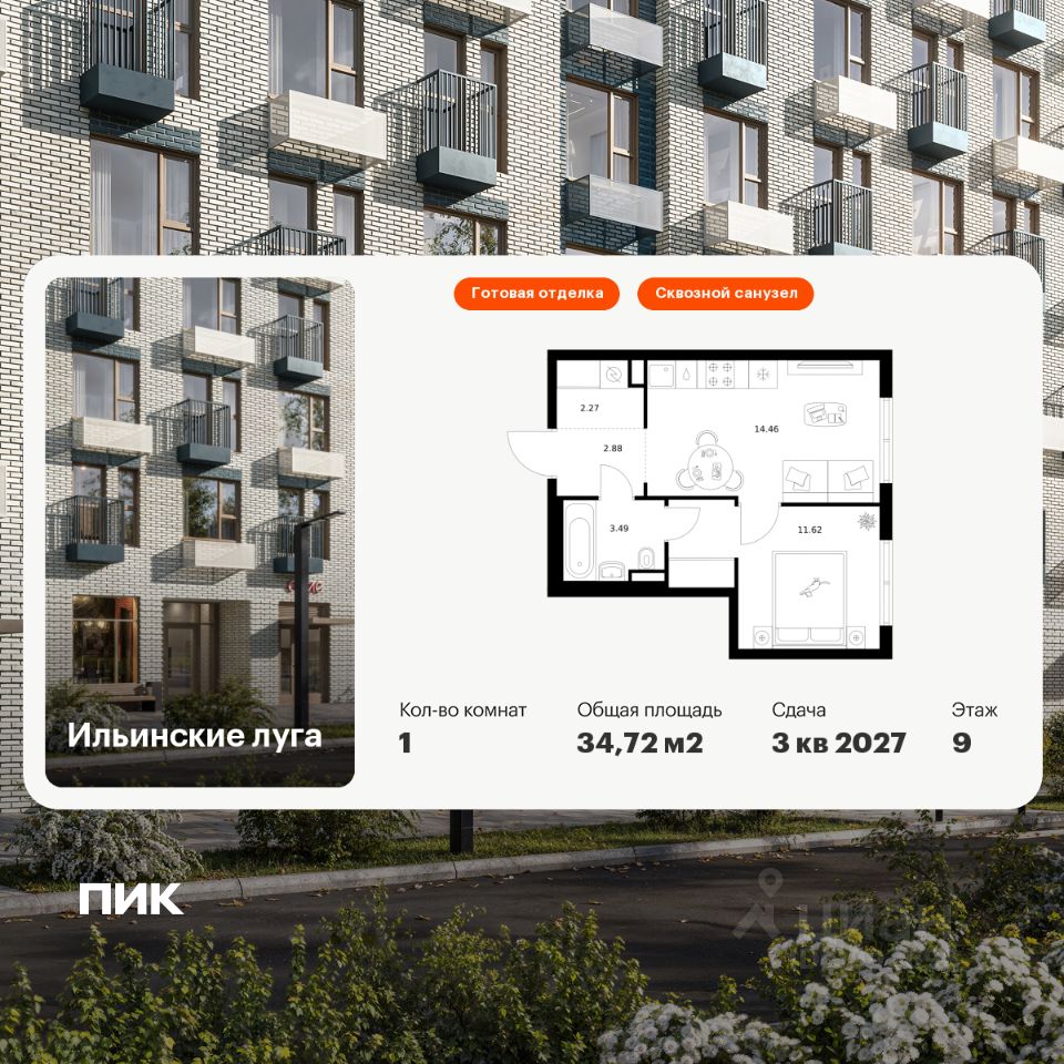 Продаётся 1-комн. квартира площадью 34,72 кв.м на 9 этаже 9 этажного дома (Корпус 4.1, Секция 4) проекта ПИК Ильинские луга. Светлый просторный подъезд на уровне земли, функциональная планировка, большие окна, c отделкой.