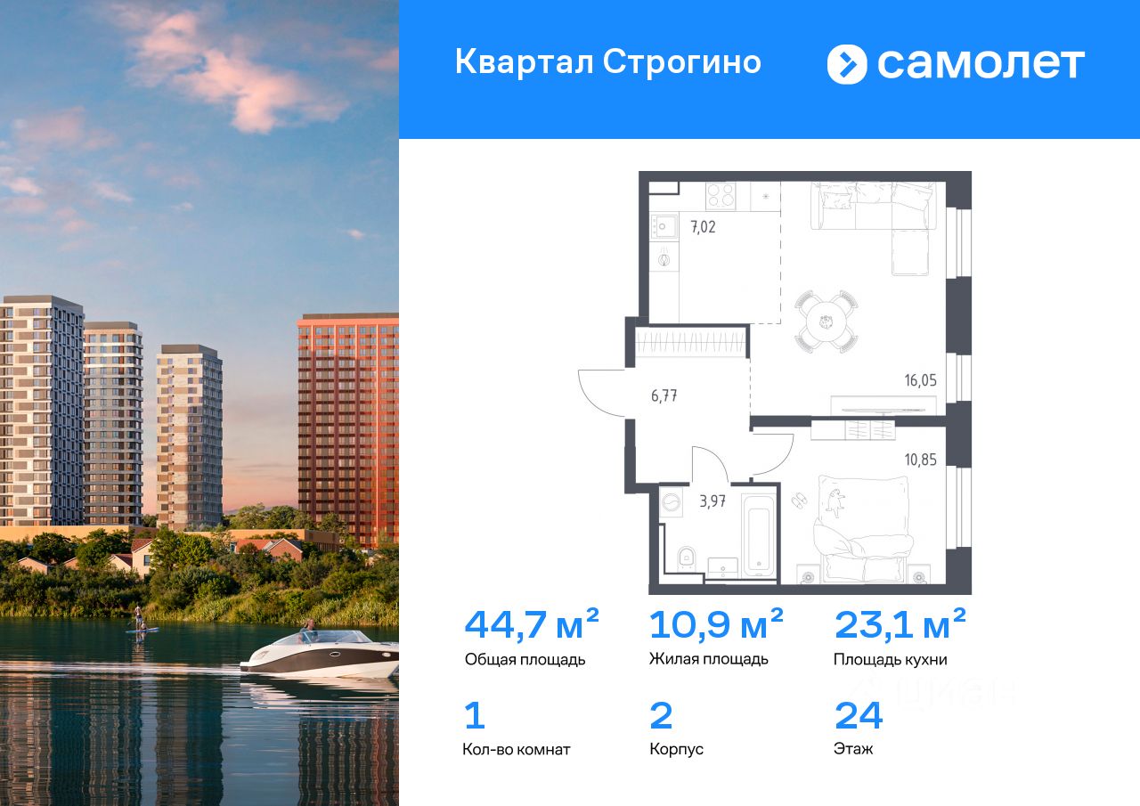 Строим кварталы для жизни с заботой о будущем. Предлагается 1-комнатная квартира комфорт-класса 44,66 кв.м в корпусе 2 на 24 этаже, в ЖК ''Квартал Строгино'' Квартира с чистовой отделкой. Доступность дополнительных опций уточняйте у застройщика.