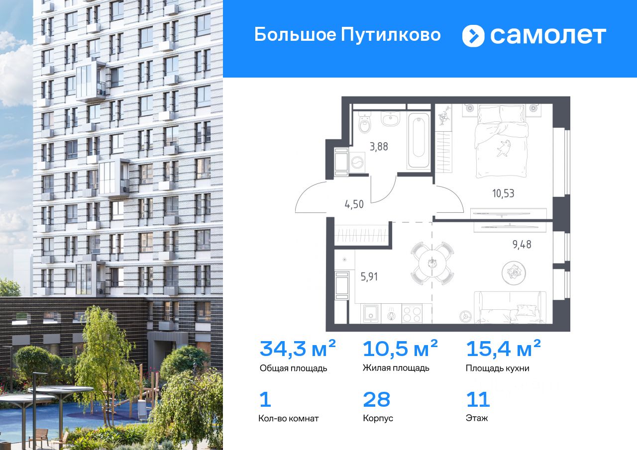 Строим кварталы для жизни с заботой о будущем. Предлагается 1-комнатная квартира комфорт-класса 34,3 кв.м в корпусе 28 на 11 этаже, в ЖК ''Большое Путилково'' Квартира без отделки. Доступность опции ''отделка'' и возможность комплектации мебелью и декором уточняйте у застройщика.
