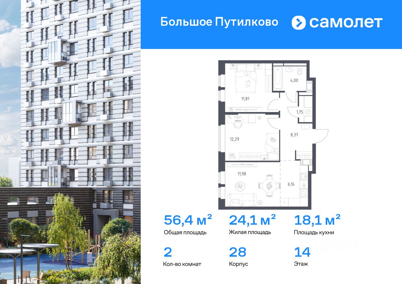 Строим кварталы для жизни с заботой о будущем. Предлагается 2-комнатная квартира комфорт-класса 56,36 кв.м в корпусе 28 на 14 этаже, в ЖК ''Большое Путилково'' Квартира с чистовой отделкой. Доступность дополнительных опций уточняйте у застройщика.