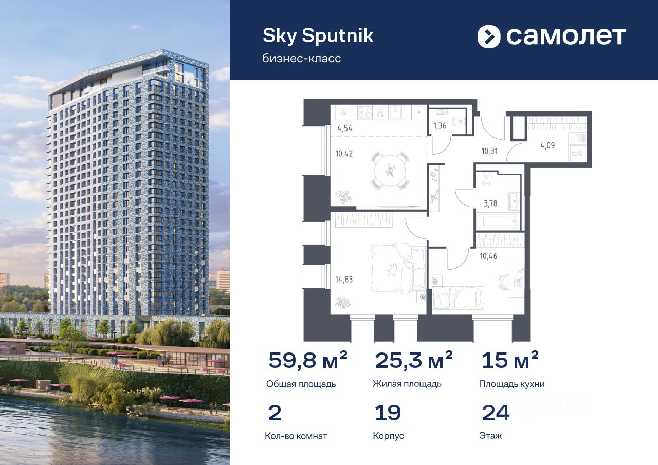 Строим кварталы для жизни с заботой о будущем. Предлагаются 2-комнатные апартаменты бизнес-класса 59,79 кв.м в корпусе 19 на 24 этаже, в Sky Sputnik Апартаменты без отделки. Доступность опции ''отделка'' и возможность комплектации мебелью и декором уточняйте у застройщика.