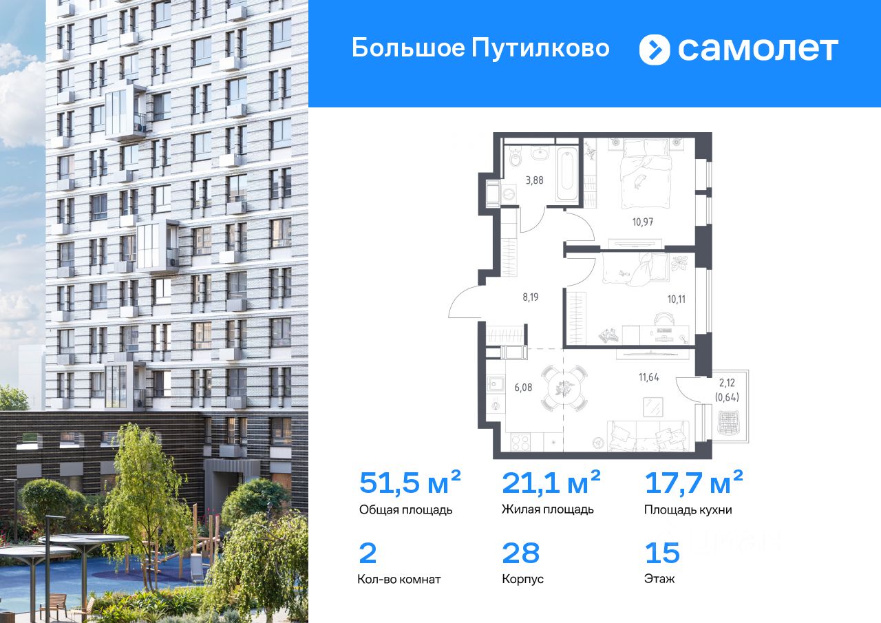 Строим кварталы для жизни с заботой о будущем. Предлагается 2-комнатная квартира комфорт-класса 51,51 кв.м в корпусе 28 на 15 этаже, в ЖК ''Большое Путилково'' Квартира с чистовой отделкой. Доступность дополнительных опций уточняйте у застройщика.