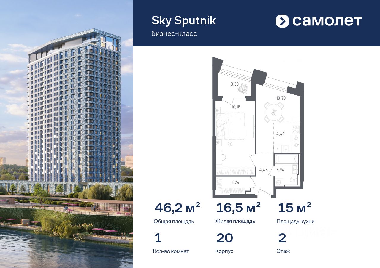 Строим кварталы для жизни с заботой о будущем. Предлагаются 1-комнатные апартаменты бизнес-класса 46,22 кв.м в корпусе 20 на 2 этаже, в Sky Sputnik Апартаменты без отделки. Доступность опции ''отделка'' и возможность комплектации мебелью и декором уточняйте у застройщика.