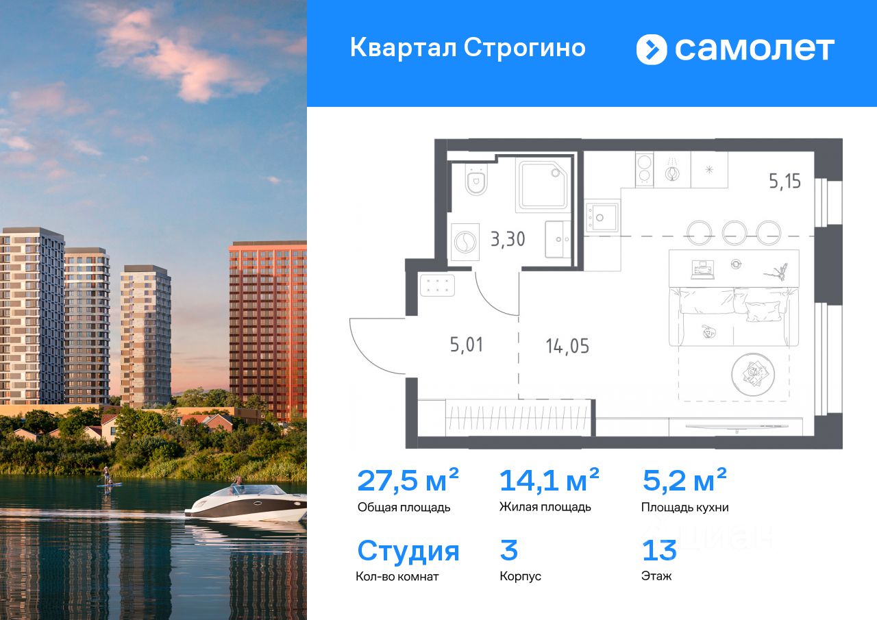 Строим кварталы для жизни с заботой о будущем. Предлагается квартира студия комфорт-класса 27,51 кв.м в корпусе 3 на 13 этаже, в ЖК ''Квартал Строгино'' Квартира без отделки. Доступность опции ''отделка'' и возможность комплектации мебелью и декором уточняйте у застройщика.