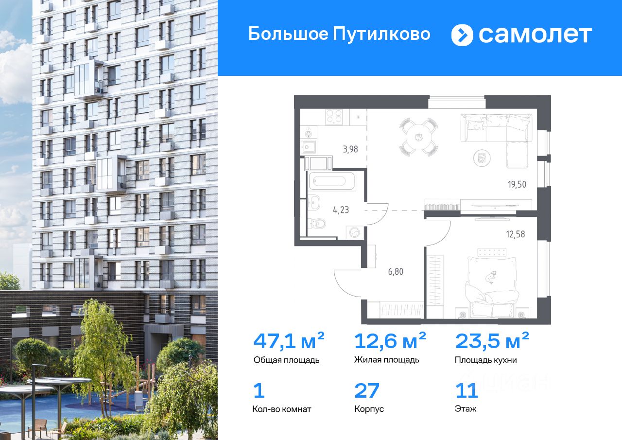 Строим кварталы для жизни с заботой о будущем. Предлагается 1-комнатная квартира комфорт-класса 47,09 кв.м в корпусе 27 на 11 этаже, в ЖК ''Большое Путилково'' Квартира с чистовой отделкой. Доступность дополнительных опций уточняйте у застройщика.