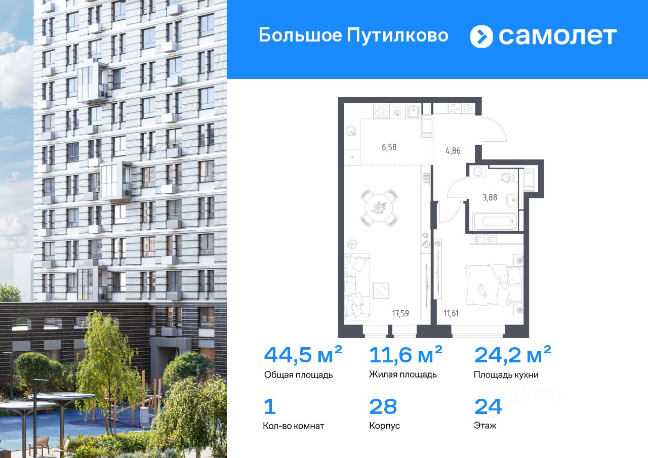 Строим кварталы для жизни с заботой о будущем. Предлагается 1-комнатная квартира комфорт-класса 44,52 кв.м в корпусе 28 на 24 этаже, в ЖК ''Большое Путилково'' Квартира с чистовой отделкой. Доступность дополнительных опций уточняйте у застройщика.