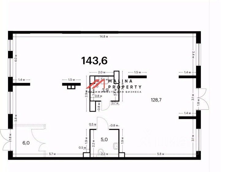 Помещение 143,6 м2, располагается на 1 этаже, открытая планировка, отдельный вход с фасада и со двора, высота потолка 3,5 м, витринные окна по фасаду. Электрическая мощность 29 кВт. Парковка перед фасадом. Место для размещения рекламы.