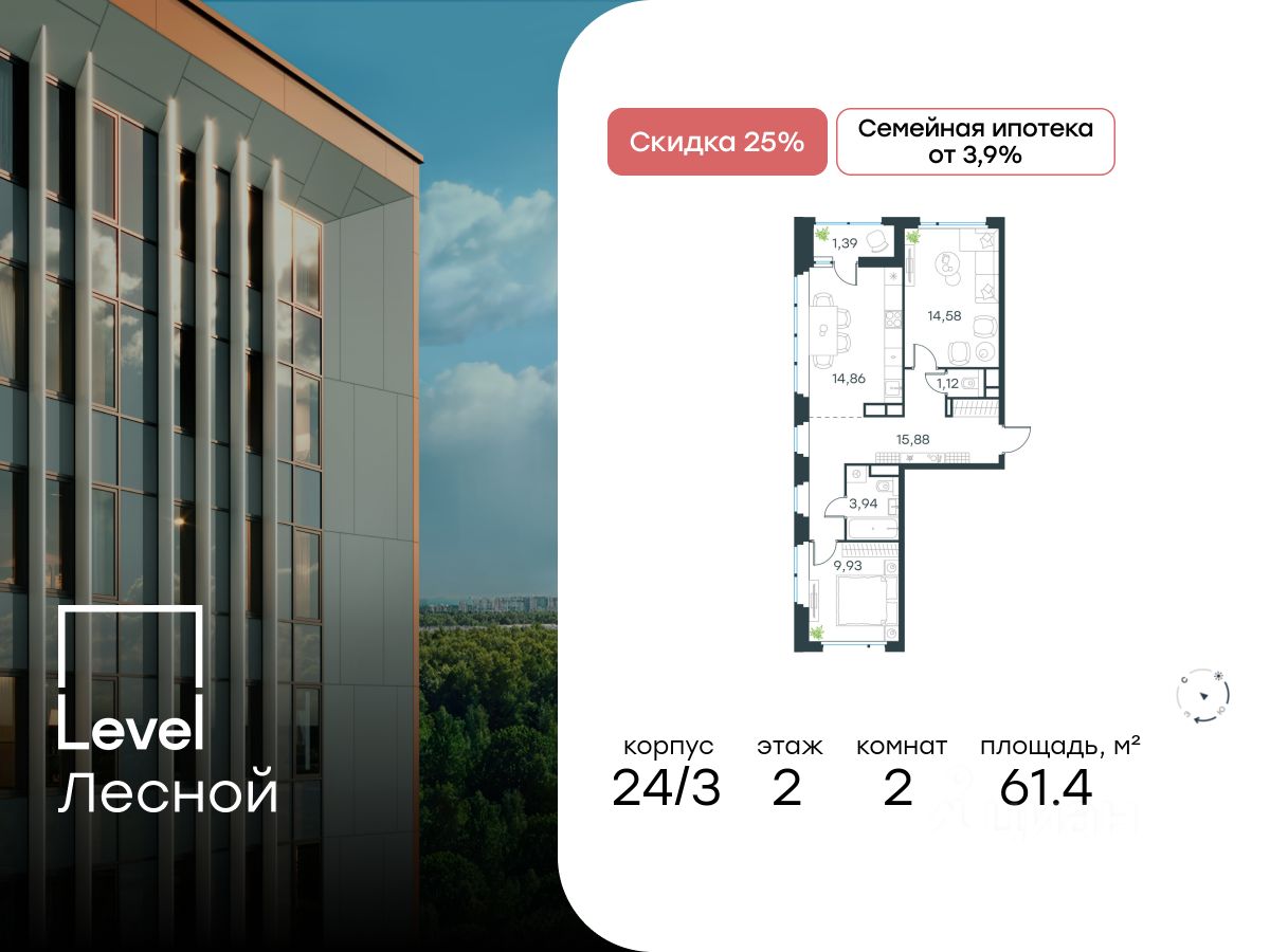 В районе, утопающем в густой зелени лесов, многочисленных парков и скверов, продаётся 2-комнатная квартира площадью 61.40 кв.м с отделкой white box. Квартира расположена на 2 этаже в жилом комплексе комфорт-класса Level Лесной (компания Level Group/Левел групп).