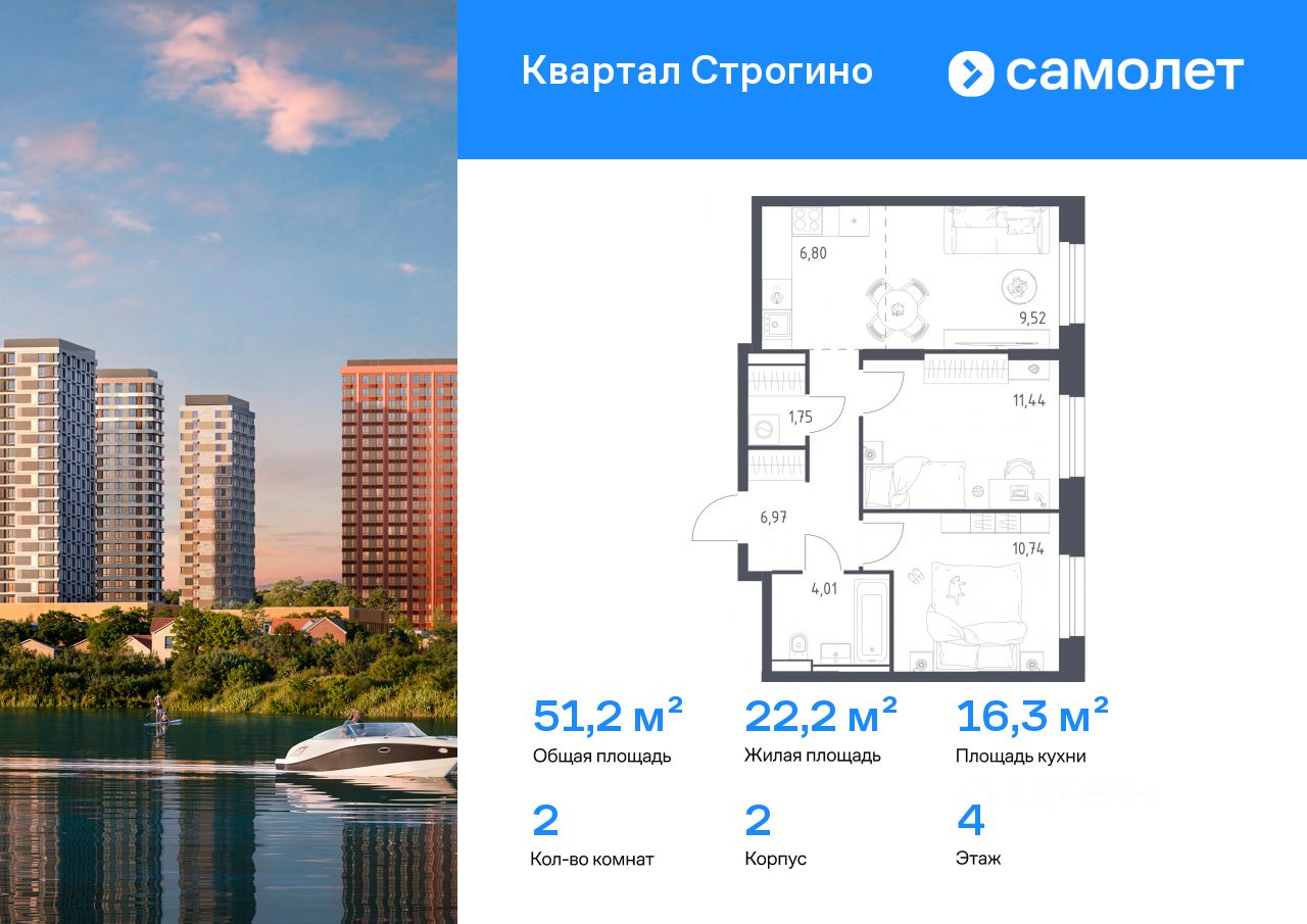 Строим кварталы для жизни с заботой о будущем. Предлагается 2-комнатная квартира комфорт-класса 51,23 кв.м в корпусе 2 на 4 этаже, в ЖК ''Квартал Строгино'' Квартира с чистовой отделкой. Доступность дополнительных опций уточняйте у застройщика.