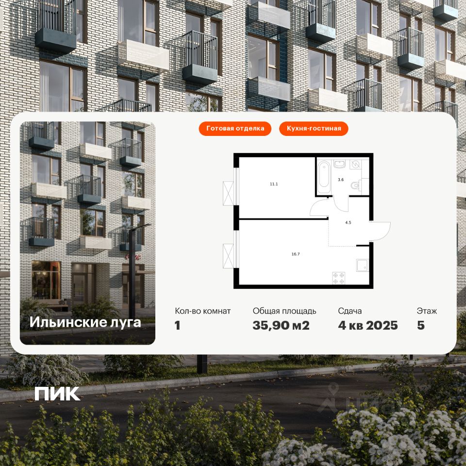 Продаётся 1-комн. квартира площадью 35,9 кв.м на 5 этаже 9 этажного дома (Корпус 2.13, Секция 2) проекта ПИК Ильинские луга. Светлый просторный подъезд на уровне земли, функциональная планировка, большие окна, c отделкой.