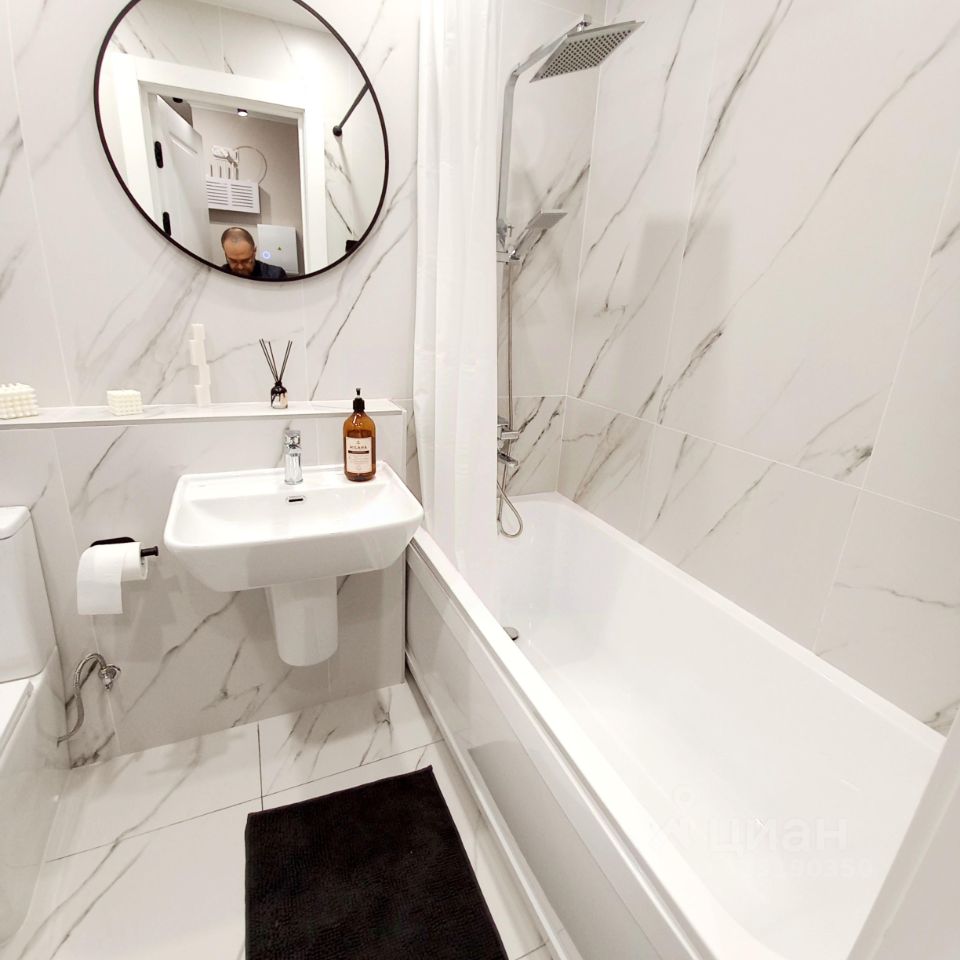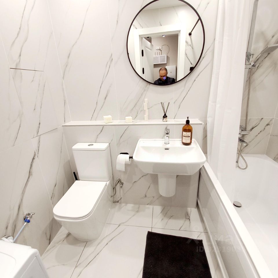 САНУЗЕЛ в светлых тонах оборудован всем необходимым (ванна, унитаз, раковина, зеркало, стиральная машина, полотенцесушитель, полки).