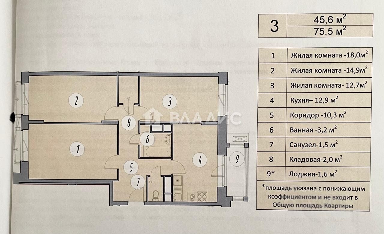 Общая площадь квартиры составляет 75,5 кв. м, из которых 45,6 кв. м приходится на жилую площадь. Грамотная планировка предусматривает три изолированные комнаты (14,9 + 12,7 + 18 кв. м), кухню площадью 14,5 кв. м и один раздельный санузел.