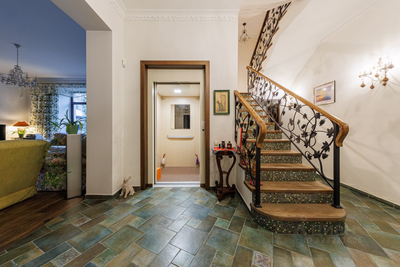 ПОЭТАЖНОЕ ОПИСАНИЕ: 1-ый уровень: прихожая, спальня с ванной комнатой и гардеробной, с/у, гардеробная, лифт, гостиная, каминный зал с выходом на террасу, кухня-столовая с кладовой, гараж на 2 м/м, котельная, двухэтажный гостевой блок (2 спальни гардеробная с/у гостиная кухня с балконом спальня с ванной комнатой кладовая)
