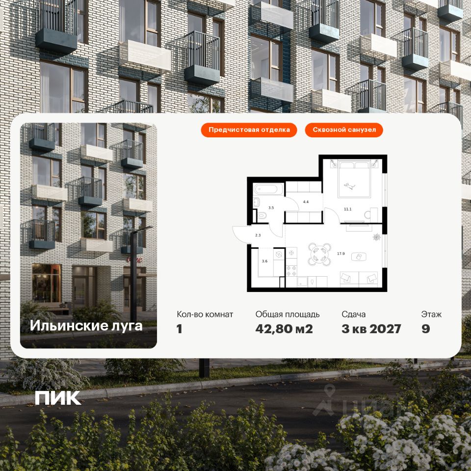 Продаётся 1-комн. квартира площадью 42,8 кв.м на 9 этаже 9 этажного дома (Корпус 4.3, Секция 1) проекта ПИК Ильинские луга. Светлый просторный подъезд на уровне земли, функциональная планировка, большие окна, предчистовая отделка.