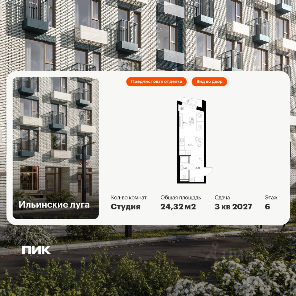 Продаётся квартира-студия площадью 24,32 кв.м на 6 этаже 9 этажного дома (Корпус 4.2, Секция 5) проекта ПИК Ильинские луга. Светлый просторный подъезд на уровне земли, функциональная планировка, большие окна, предчистовая отделка.
