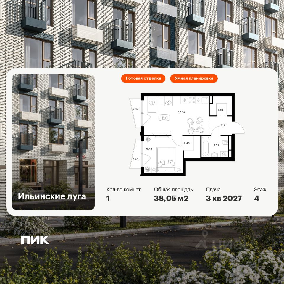 Продаётся 1-комн. квартира площадью 38,05 кв.м на 4 этаже 9 этажного дома (Корпус 4.2, Секция 2) проекта ПИК Ильинские луга. Светлый просторный подъезд на уровне земли, функциональная планировка, большие окна, c отделкой.