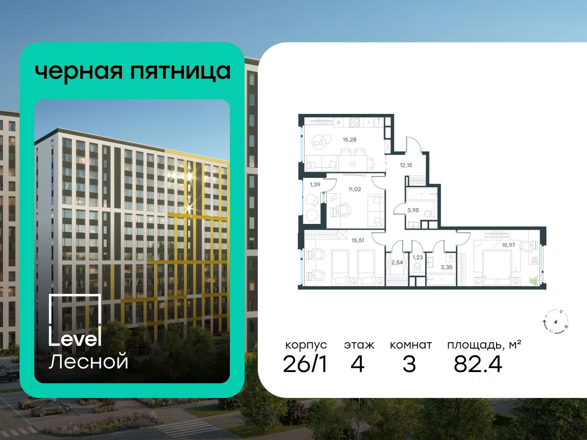 В районе, утопающем в густой зелени лесов, многочисленных парков и скверов, продаётся 3-комнатная квартира площадью 82.40 кв.м с отделкой white box. Квартира расположена на 4 этаже в жилом комплексе комфорт-класса Level Лесной (компания Level Group/Левел групп).