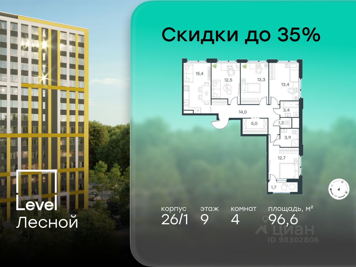 В районе, утопающем в густой зелени лесов, многочисленных парков и скверов, продаётся 4-комнатная квартира площадью 96.60 кв.м с отделкой white box. Квартира расположена на 9 этаже в жилом комплексе комфорт-класса Level Лесной (компания Level Group/Левел групп).