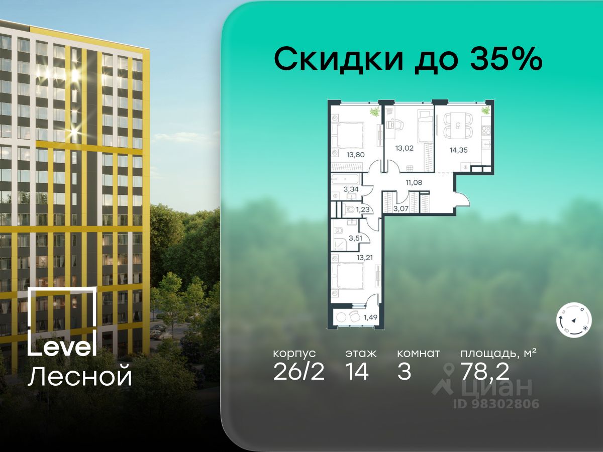В районе, утопающем в густой зелени лесов, многочисленных парков и скверов, продаётся 3-комнатная квартира площадью 78.20 кв.м без отделки. Квартира расположена на 14 этаже в жилом комплексе комфорт-класса Level Лесной (компания Level Group/Левел групп).