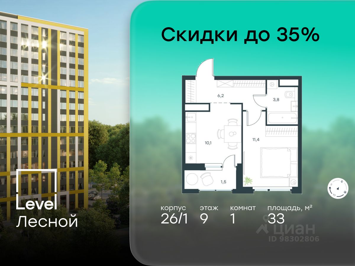 В районе, утопающем в густой зелени лесов, многочисленных парков и скверов, продаётся 1-комнатная квартира площадью 33.00 кв.м с отделкой white box. Квартира расположена на 9 этаже в жилом комплексе комфорт-класса Level Лесной (компания Level Group/Левел групп).