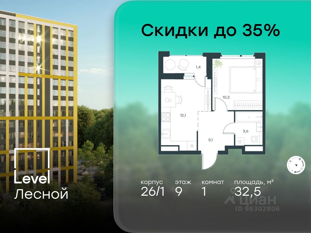 В районе, утопающем в густой зелени лесов, многочисленных парков и скверов, продаётся 1-комнатная квартира площадью 32.50 кв.м с отделкой white box. Квартира расположена на 9 этаже в жилом комплексе комфорт-класса Level Лесной (компания Level Group/Левел групп).