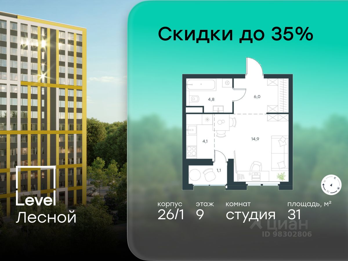 В районе, утопающем в густой зелени лесов, многочисленных парков и скверов, продаётся студия площадью 31.00 кв.м с отделкой white box. Квартира расположена на 9 этаже в жилом комплексе комфорт-класса Level Лесной (компания Level Group/Левел групп).