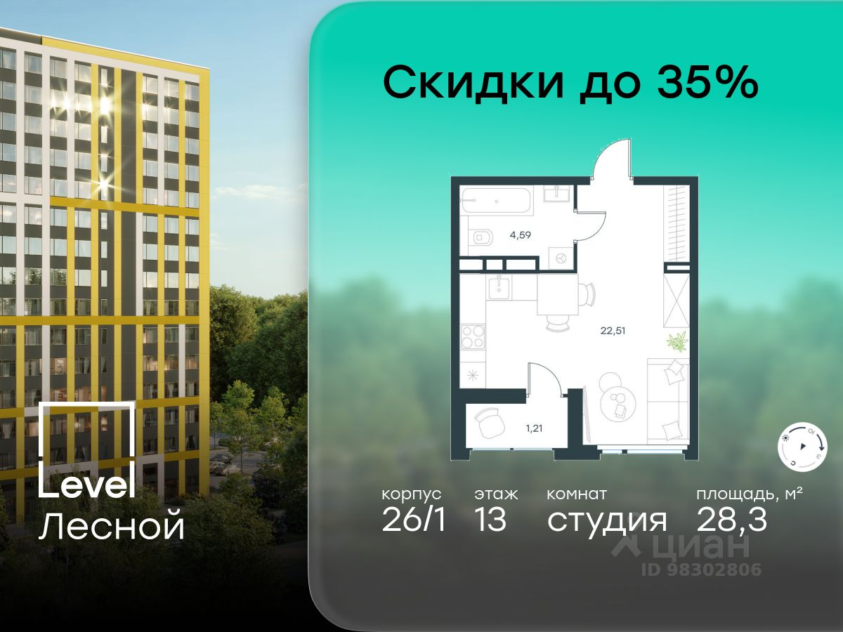 В районе, утопающем в густой зелени лесов, многочисленных парков и скверов, продаётся студия площадью 28.30 кв.м с отделкой white box. Квартира расположена на 13 этаже в жилом комплексе комфорт-класса Level Лесной (компания Level Group/Левел групп).