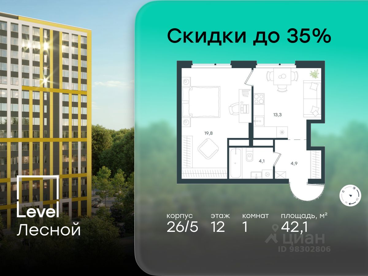 В районе, утопающем в густой зелени лесов, многочисленных парков и скверов, продаётся 1-комнатная квартира площадью 42.10 кв.м с отделкой white box. Квартира расположена на 12 этаже в жилом комплексе комфорт-класса Level Лесной (компания Level Group/Левел групп).