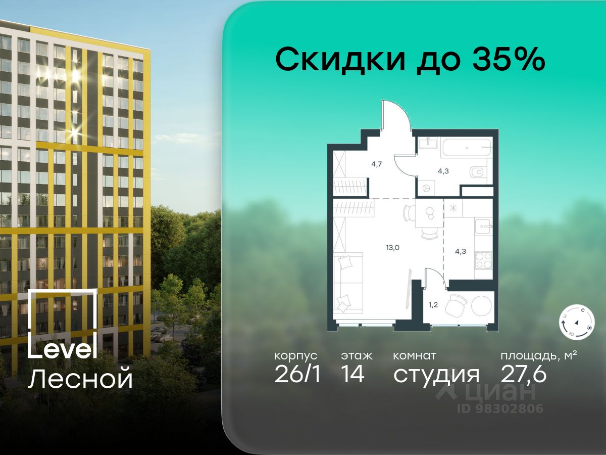 В районе, утопающем в густой зелени лесов, многочисленных парков и скверов, продаётся студия площадью 27.60 кв.м с отделкой white box. Квартира расположена на 14 этаже в жилом комплексе комфорт-класса Level Лесной (компания Level Group/Левел групп).