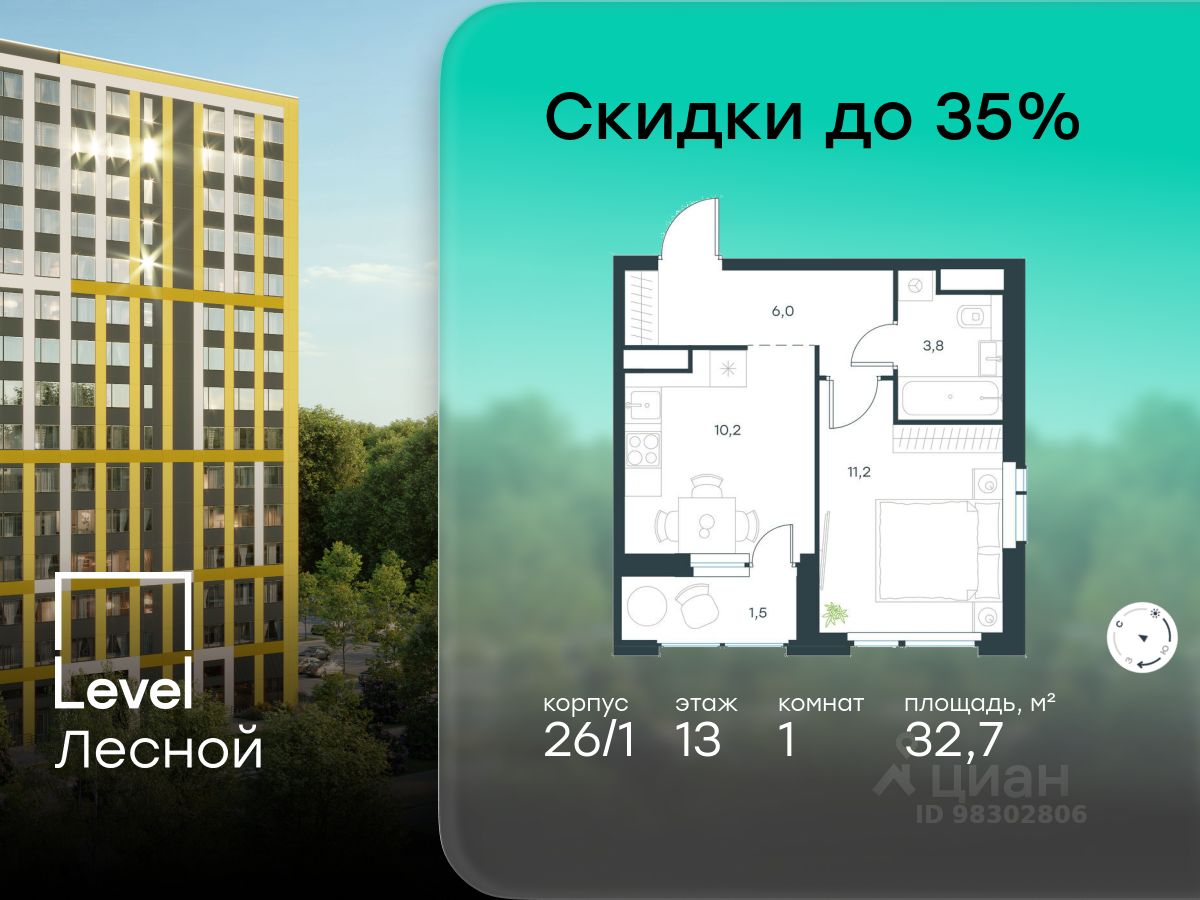 В районе, утопающем в густой зелени лесов, многочисленных парков и скверов, продаётся 1-комнатная квартира площадью 32.70 кв.м с отделкой white box. Квартира расположена на 13 этаже в жилом комплексе комфорт-класса Level Лесной (компания Level Group/Левел групп).
