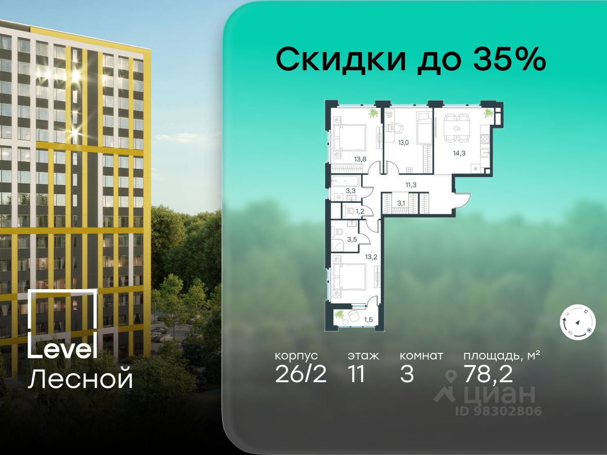 В районе, утопающем в густой зелени лесов, многочисленных парков и скверов, продаётся 3-комнатная квартира площадью 78.20 кв.м без отделки. Квартира расположена на 11 этаже в жилом комплексе комфорт-класса Level Лесной (компания Level Group/Левел групп).