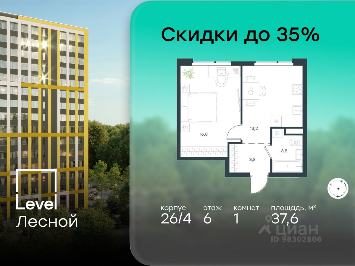 В районе, утопающем в густой зелени лесов, многочисленных парков и скверов, продаётся 1-комнатная квартира площадью 37.60 кв.м с отделкой white box. Квартира расположена на 6 этаже в жилом комплексе комфорт-класса Level Лесной (компания Level Group/Левел групп).
