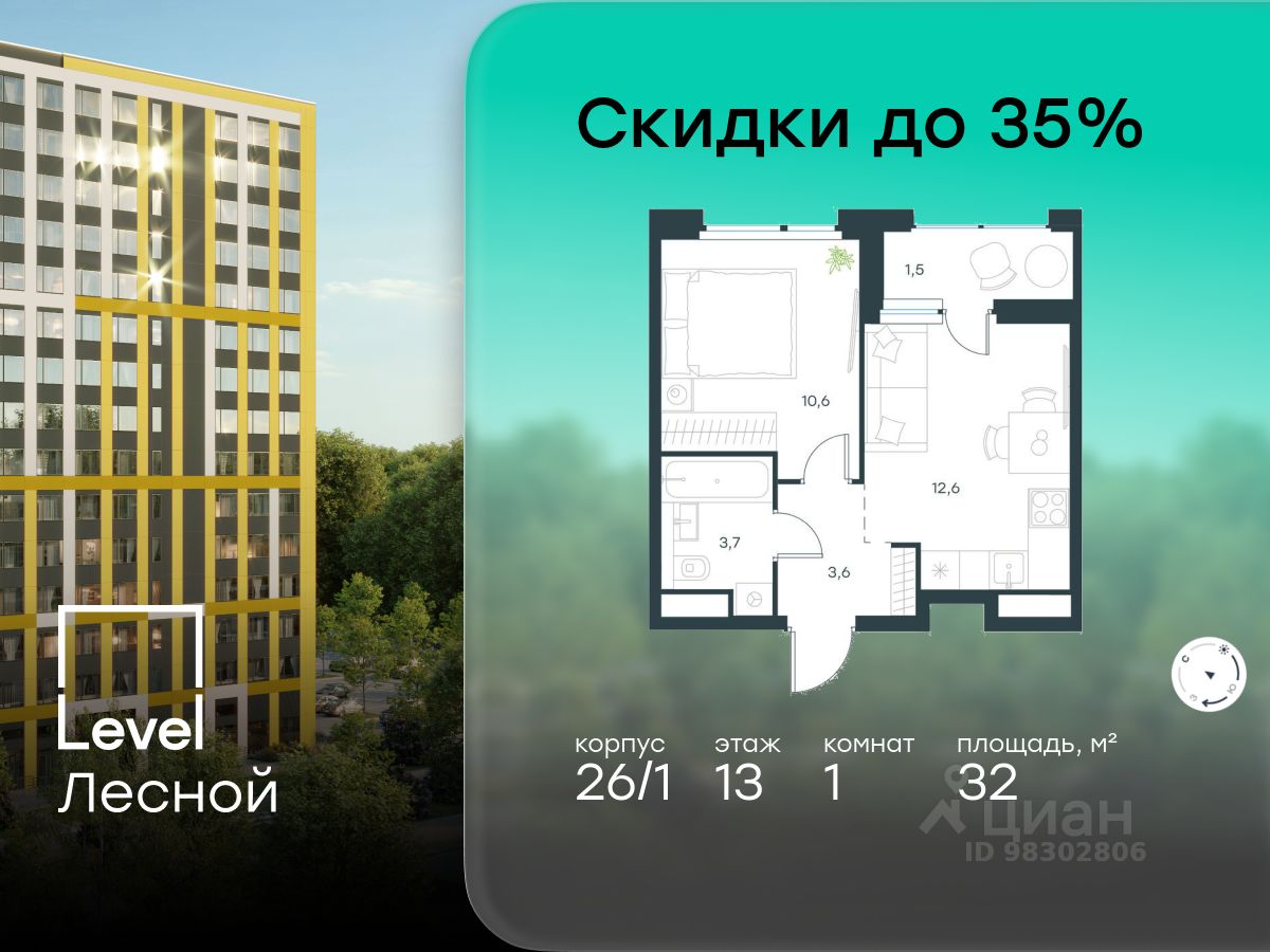 В районе, утопающем в густой зелени лесов, многочисленных парков и скверов, продаётся 1-комнатная квартира площадью 32.00 кв.м с отделкой white box. Квартира расположена на 13 этаже в жилом комплексе комфорт-класса Level Лесной (компания Level Group/Левел групп).